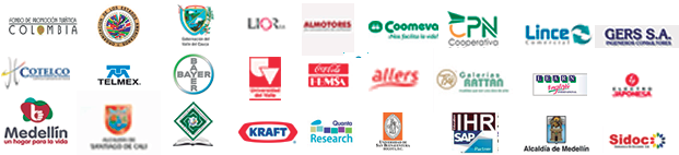 Fondo de Promoción Turistica - Organizacion de Estados Americanos OEA - Policia Nacional del Ecuador CPN - Sidoc - Lince Seguridad - Electrojaponesa - Gers - Almotores - Bayer - IHR Education Mexico - Academia Arabe Panameña - Lior Internacional Zona Libre - Éxito - Cadbury Adams - Kraft - Colpacifico - Coomeva - Cotelvalle - Cotelco - Universidad San Buenaventura - Quanta - Telmex - Universidad del Valle - Allers - Coca cola Femsa - Learn English - Alcaldia de Cali - Alcaldia de Medellín - WWB - Cotelco Cartagena -